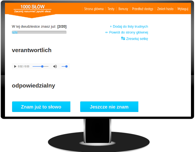 Nauka odbywa się na specjalnej stronie internetowej - widzisz dane słówko po niemiecku, jego tłumaczenie i możesz odtwarzać jego wymowę.